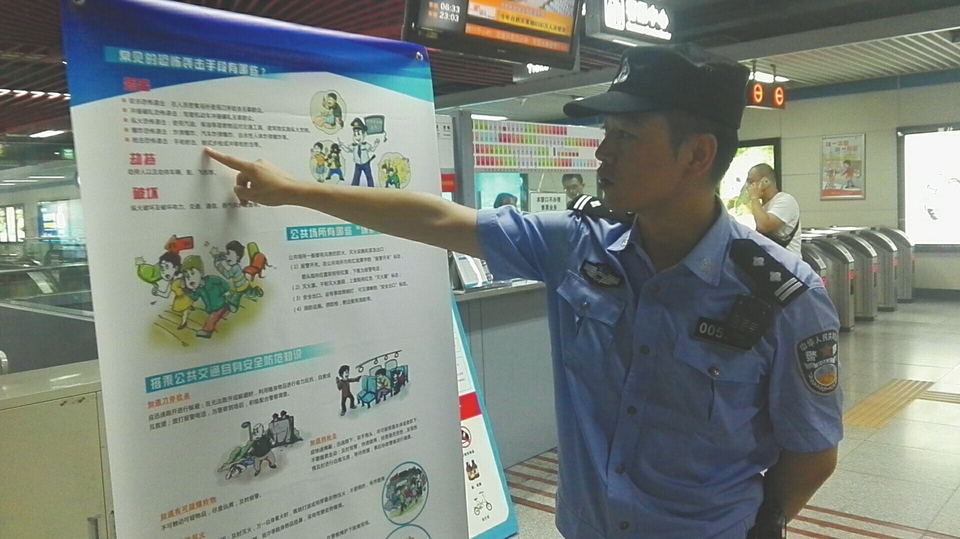 成都市公安局公交地鐵分局升仙湖站派出所副所長(zhǎng)李欣向乘客介紹地鐵站安防知識(shí)。