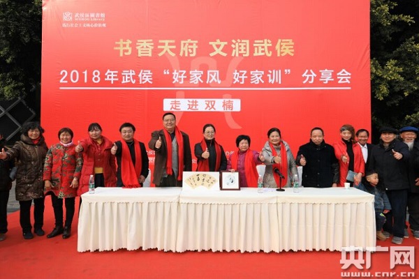央廣網(wǎng)成都1月28日消息(記者韓民權(quán))為踐行社會主義核心價值觀,使文化融入百姓生活。1月28日,由成都市武侯區(qū)圖書館主辦的“書香天府·文潤武侯‘好家風·好家訓(xùn)’分享會”第二站在成都武侯區(qū)雙楠街道舉行,將多彩的文化活動送到了百姓身邊。當天,分享嘉賓與市民代表們分享了自己的好家風故事,并將優(yōu)秀的家風、家訓(xùn)存入了“家風銀行”。