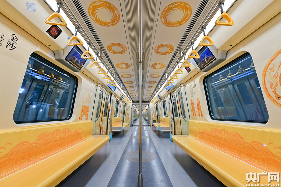 首發(fā)列車金沙專列以“多彩的金沙王國”為主題,整個車體和車廂內(nèi)部主色調(diào)為金色,以太陽、神鳥、眼睛三大圖騰符號為核心,同時選取了大黃金面具、銅立人、銅人形器、象牙等金沙博物館出土的重要文物元素,用抽象化、概括性的手法對其進行融合創(chuàng)新,最終形成四幅主題畫面——騎神鳥的射箭者、手捧祭壇的大祭司、守護祭壇和太陽神鳥的金沙武士,以及祭壇圣火中鍛造的黃金面具,模仿敦煌壁畫的表現(xiàn)形式,分別繪制于車廂內(nèi)部每扇車門以及司機門上,讓乘客仿佛穿越到三千年前,親眼見證一場盛大的祭祀儀式,感受金沙先民獻(xiàn)祭天神、祈求平安幸福的虔誠。
