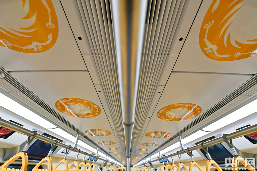 同時,設(shè)計師借鑒莫斯科地鐵將國家博物館展品搬進地鐵車廂的創(chuàng)意,將魚類、金形蛙器、帶柄有領(lǐng)青銅器等圖騰和文物進行藝術(shù)處理,精心提煉出若干個小元素,貫穿于車體、車窗、車廂墻面等處,車廂地面、頂棚均以太陽神鳥金飾圖案作為點綴,四只神鳥簇?fù)淼膹V告框、以金沙出土文物造型為靈感設(shè)計的把手,以及椅背的黃色帶山背景等細(xì)節(jié),展現(xiàn)出原汁原味的金沙文化,在地鐵車廂內(nèi)打造出一個移動的金沙博物館,讓乘客在乘坐地鐵的同時也仿佛進行了一場博物館奇妙之旅,飽覽金沙珍貴文物,盡情感受金沙文明帶來的震撼。而在車體外側(cè)的圖案則精心繪制出重影效果,當(dāng)列車駛過站臺時,畫面將呈現(xiàn)出立體效果,讓車站候車的乘客也能一秒“穿越”到金沙王國。
