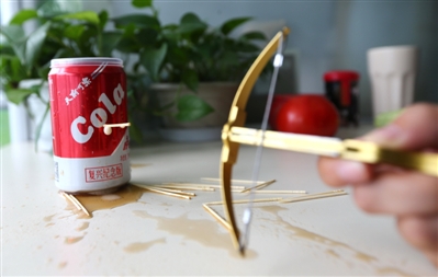 巴掌大小,以發(fā)射牙簽為主的牙簽弩,正在成都小學(xué)生中流行。射穿紙張易如反掌,刺入易拉罐不是難事,據(jù)網(wǎng)上試驗(yàn)報(bào)道,牙簽弩配上鐵針,威力更大。