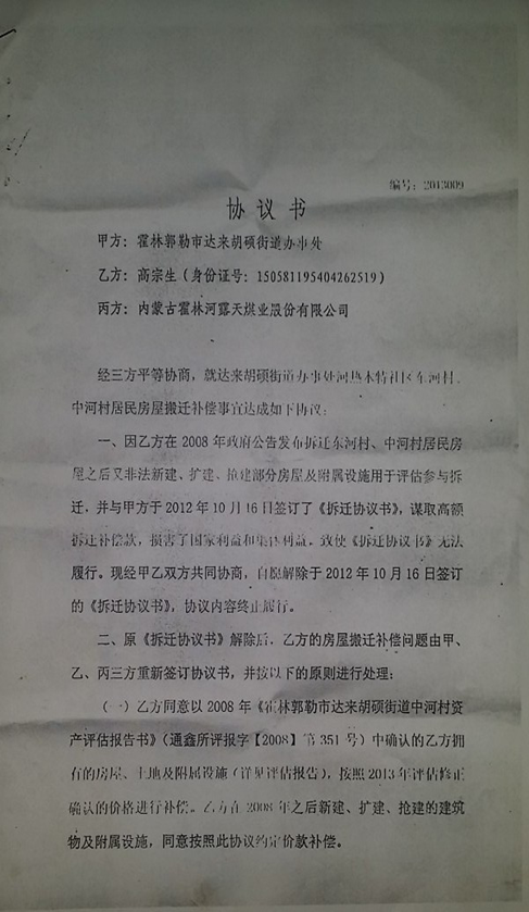 村民稱,內(nèi)蒙古霍林郭勒市政府2008年起對原東、中河村整體拆遷規(guī)劃并實施。因資金問題搬走240戶,剩余61戶未實施搬遷。2012年10月18日剩余的61戶與政府簽訂拆遷補償協(xié)議,并按照協(xié)議內(nèi)容要求在15日內(nèi)自行拆除了房屋及附屬設(shè)施,但時至今日仍然沒有收到政府支付的房屋等補償款。半年后政府認為已經(jīng)拆除的房屋及服務(wù)設(shè)施評估數(shù)量有問題,要求在沒有任何建筑物的情況下,依據(jù)2008年和2012年初的數(shù)字重新評估,然后簽訂政府、企業(yè)和群眾的三方協(xié)議。因重新評估后原賠償數(shù)額直接減半,為此老百姓拒絕簽字并多次逐級上訪到通遼、內(nèi)蒙古及北京,在上級政府批示及上訪壓力下霍林郭勒市政府專門成立了推進組和調(diào)查組解決中、東河村拆遷補償問題。