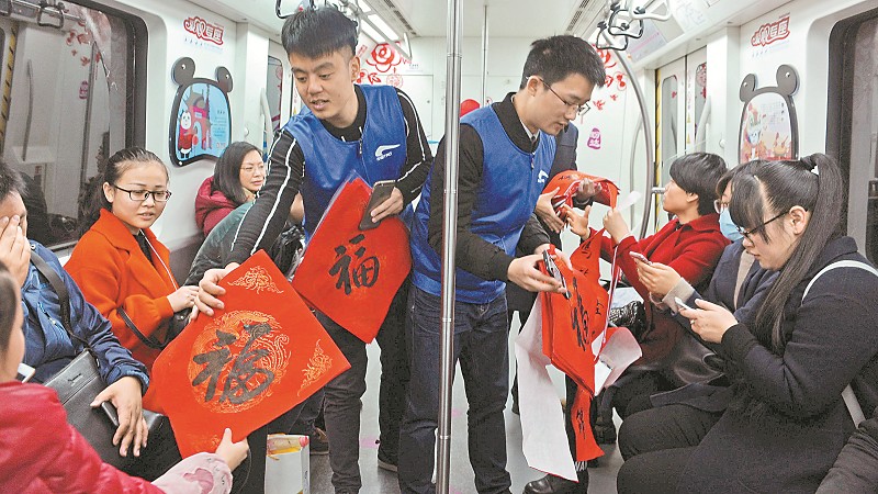 春節(jié)將至,成都地鐵3號線“盼達(dá)”號熊貓主題列車換上了“新衣裳”。1月24日,工作人員特意為乘客送上一份由地鐵職工書寫的新春對聯(lián)和大紅“福”字。