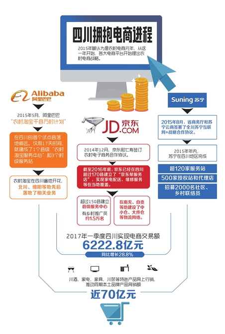 四川是農(nóng)業(yè)大省,自2014年以來,包括京東、阿里、蘇寧等主流電商企業(yè)已經(jīng)注意到了這塊巨大的農(nóng)村電商蛋糕,并且開始了搶灘大戰(zhàn)。在這幾年的過程中,它們對四川的農(nóng)村帶來了許多改變。