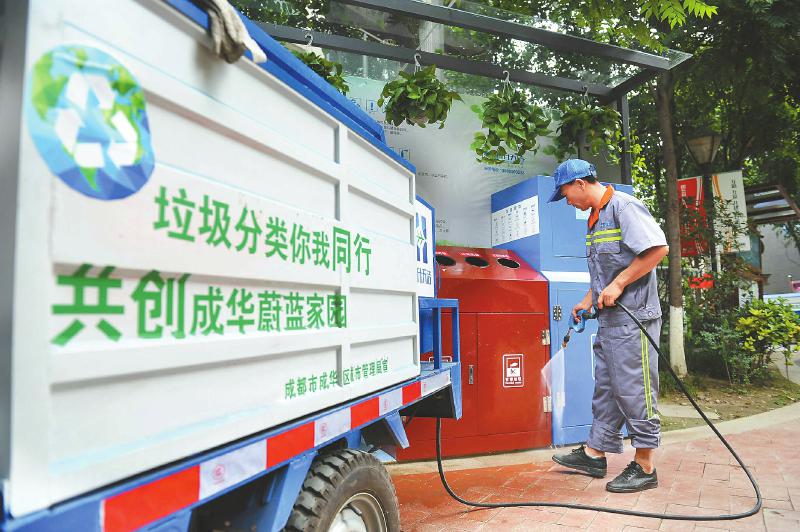 8月1日,成都市成華區(qū)府青路街道一居民小區(qū),居民正在往專設的分類垃圾箱內扔垃圾。