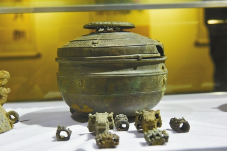 在展出的青銅器中,除了兵器,還有鼎、壺、敦、盞等典型的楚文化器物。其中一件青銅盞,蓋、身大部分飾蟠螭紋,脈絡(luò)幽密,捉手、器耳、器足采用透雕、浮雕等細(xì)微工藝,匠心玲瓏,足見(jiàn)當(dāng)時(shí)制造工藝之精湛。