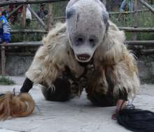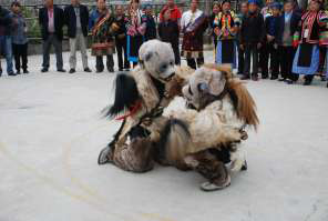 戴上石膏造型的熊貓頭盔,穿上山羊皮制的熊貓皮,接上牦牛尾做的熊貓尾巴,兩只“大熊貓”走上舞臺,或蹲、或坐、或滾,爬樹、蹭癢、壘窩……這是44歲的熊貓舞傳人毛云安和徒弟的一段表演。