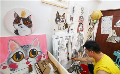 伍林發(fā)現(xiàn)自己的畫火了,緣于一副他創(chuàng)作的胖貓露牙的《虎嘯山林圖》火了,竟有不少人想花錢買下。2004年,伍林從四川大學(xué)藝術(shù)學(xué)院油畫班肄業(yè),進(jìn)了游戲公司負(fù)責(zé)美術(shù)設(shè)計。后來,他辭職赴上海工作。團(tuán)隊建設(shè)、產(chǎn)品設(shè)計,慢慢地,游戲開發(fā)工作讓他心生厭倦。2015年年底,辭職后的伍林又回到成都,開始“專職”畫貓。因為畫貓,他已是網(wǎng)上紅人,賣畫收入超過做游戲開發(fā)總監(jiān)時的收入,F(xiàn)在,他的微博@還是一碗泡面已擁有117萬粉絲。因知道自己拖稿,他從不接訂單也不跟機(jī)構(gòu)合作,因為跟機(jī)構(gòu)簽了合同后,就要受截稿時間限制,這不符合他“想畫就畫”的風(fēng)格。成都商報記者 于遵素 攝影記者 王紅強(qiáng)