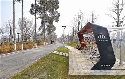 鹿溪智谷綠道,升降式共享單車(chē)停車(chē)棚
