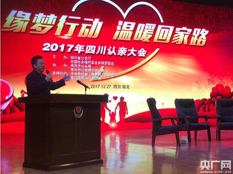 央廣網(wǎng)成都12月27日消息(記者劉濤)12月27日上午,“緣夢行動,溫暖回家路”2017四川大型認親大會在南充順慶大禮堂舉行。7名被拐20多年的受害人,與家人得以團聚。