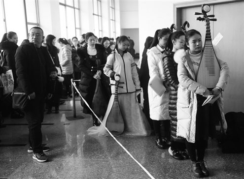 2月14日,2017年藝考趕考第十日,山藝音樂表演專業(yè)進(jìn)入復(fù)試,復(fù)試現(xiàn)場向媒體開放。盡管十天“連軸轉(zhuǎn)”式趕考讓人疲憊不堪,但眼看就要開考,考生立馬打起十二分精神。等待期間,還不時(shí)對(duì)著樂器練手。相對(duì)于考生的神采奕奕,陪考家長臉上已經(jīng)露出疲態(tài)!巴,錢包也累!睎|營一考生家長笑著說。