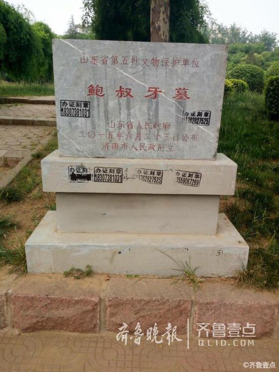 從壹粉提供的照片上看,鮑叔牙墓石碑的碑身和底座上被印滿了“辦證刻章”的小廣告,令人不忍直視。