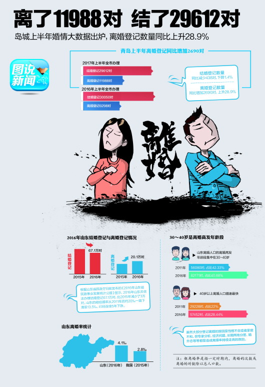 而根據(jù)山東省民政廳發(fā)布的《2016年山東省民政事業(yè)發(fā)展統(tǒng)計公報》顯示,2016年山東共依法辦理結(jié)婚登記67.1萬對,比2015年減少了3萬對。山東的粗結(jié)婚率從2011年的約20‰一路下滑至13.5‰,已經(jīng)連續(xù)5年下跌。結(jié)婚的越來越少,離婚的卻越來越多,2016年民政部門登記離婚20.1萬對,比2015年多了1.6萬對,粗離婚率為4.1‰,比10年前的約1.5‰,高出了近3倍。雖然大部分登記離婚的原因是性格不合或者家庭不和,但專家分析,經(jīng)濟問題、長期兩地分居、婚外戀等等都是造成離婚率持續(xù)走高的原因。