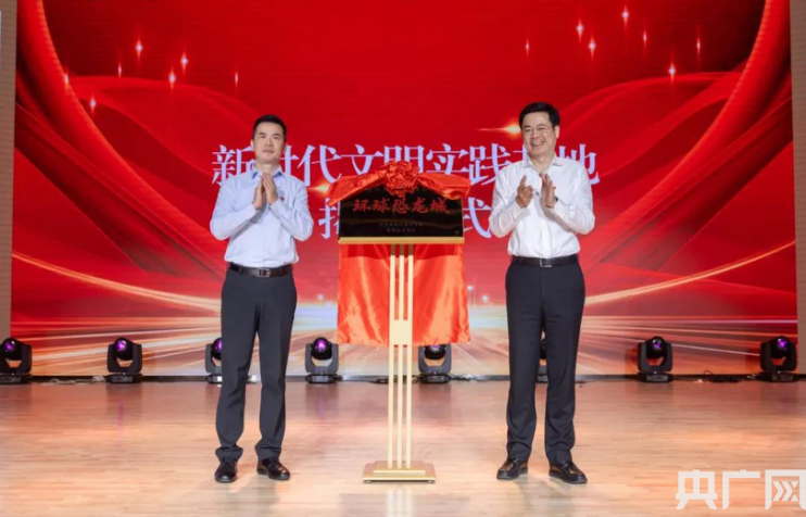 常州市委常委、宣傳部部長(zhǎng)陳濤(右)與恐龍園文化旅游集團(tuán)黨委書記、董事局主席、首席執(zhí)行官沈波(左)共同為環(huán)球恐龍城“新時(shí)代文明實(shí)踐基地”揭牌(央廣網(wǎng)發(fā) 恐龍園集團(tuán)供圖)