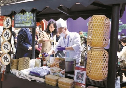 “來到了徽州府,從此愛上了毛豆腐……”在安徽展區(qū),“超級皖”美食板塊前圍滿了美食愛好者。工作人員一邊展示長滿白色菌絲的毛豆腐,一邊將之放入鍋中,等待毛豆腐煎至金黃的間隙,還拿來快板唱了一段。“毛豆腐是我們當(dāng)?shù)氐姆沁z美食,這個賣小吃的擔(dān)子叫作駱駝?chuàng)!惫ぷ魅藛T說。本屆文博會安徽文化產(chǎn)業(yè)綜合展共有153家單位參展,較去年增加31家企業(yè),其中“超級皖”美食板塊共有吳山貢鵝大酒店、蕪湖四季春、安徽詹氏食品、歙縣披云山莊等23家企業(yè)參展,給參觀者帶來地道的安徽美食。