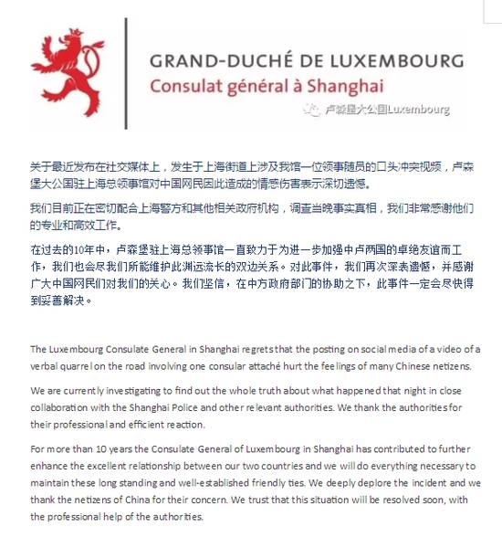 4月9日,盧森堡駐上海總領(lǐng)事館就發(fā)生于上海街道涉及一位領(lǐng)事隨員的口頭沖突視頻發(fā)表官方聲明:關(guān)于最近發(fā)布在社交媒體上,發(fā)生于上海街道上涉及我館一位領(lǐng)事隨員的口頭沖突視頻,盧森堡大公國駐上?傤I(lǐng)事館對中國網(wǎng)民因此造成的情感傷害表示深切遺憾。我們目前正在密切配合上海警方和其他相關(guān)政府機構(gòu),調(diào)查當晚事實真相,我們非常感謝他們的專業(yè)和高效工作。