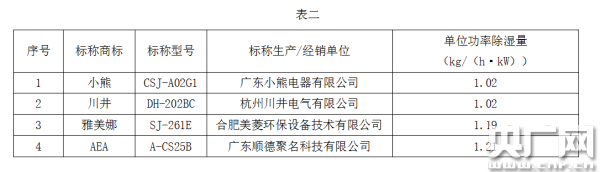 作為評價除濕機除濕效率的一個重要指標,除濕效率(單位輸入功率除濕量)同樣差異明顯。據(jù)了解,單位輸入功率除濕量是名義除濕量與輸入功率的比值,數(shù)值越高說明產(chǎn)品在相同耗電量的情況下,除濕能力越強,產(chǎn)品越節(jié)能。測試結(jié)果顯示,數(shù)值最高達到1.85 kg/(h·kW),最低的為1.02 kg/(h·kW),其中3件樣品的數(shù)值在1.6 kg/(h·kW)以上,除濕效率高;4件樣品在1.3 kg/(h·kW)以下,除濕效率較低(詳見表二)。例如輸入功率為0.209kW的小熊除濕機(標稱型號:CSJ-A02G1),其單位輸入功率除濕量僅為1.02 kg/(h·kW),兩者相差超過50%。