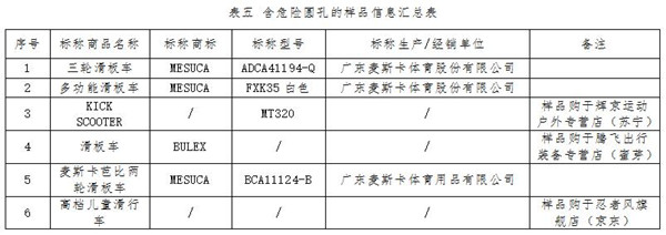 此外,有6件樣品含危險(xiǎn)圓孔,7件樣品含危險(xiǎn)夾手間隙。目前多數(shù)兒童滑板車都是可調(diào)節(jié)高度的,主要依靠把立管上的多個(gè)圓形定位孔來(lái)調(diào)節(jié)高度。如果把立管的壁很薄而且其上圓孔與兒童手指粗細(xì)差不多,則可能存在兒童手指伸入孔內(nèi)后被卡住的風(fēng)險(xiǎn)。標(biāo)準(zhǔn)要求,兒童滑板車在任何厚度小于1.58mm的剛性材料上,深度不小于10mm的可觸及圓孔的直徑不應(yīng)在6-12mm之間。測(cè)試結(jié)果顯示,有6件樣品含有尺寸危險(xiǎn)的圓孔(見(jiàn)表五),即在管壁厚度小于1.58mm處存在直徑在6-12mm之間且深度超過(guò)10mm的圓孔。