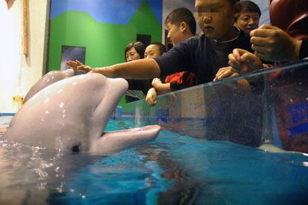 當(dāng)時(shí),兩位最早的特殊“醫(yī)生”是“君君”和已經(jīng)退休的“偉偉”。馴養(yǎng)師提著裝滿小魚的水桶走到水邊,讓它倆吃飽喝足。心滿意足后,它們?cè)诒乔焕锇l(fā)出尖銳的聲音,似乎在歡呼一樣。20歲的“偉偉”個(gè)頭較大、渾身雪白,相比之下動(dòng)作緩慢,見到生人就會(huì)悄無聲息鉆入水中。當(dāng)時(shí)它已沒有足夠體力接待小患者,越來越多的表演任務(wù)也落到“君君”身上,它也難以再超負(fù)荷工作。