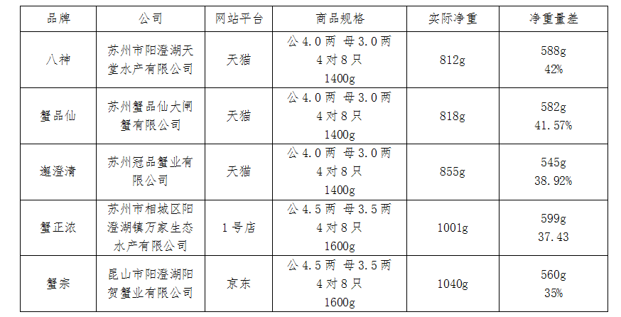 經(jīng)過(guò)對(duì)計(jì)劃時(shí)間內(nèi)到貨的23件大閘蟹產(chǎn)品的稱重,發(fā)現(xiàn)全部產(chǎn)品均存在短斤缺兩的問(wèn)題,凈重量差在10.28%至42%不等。本次體察中分量相差最大的5件商品詳見(jiàn)下表。