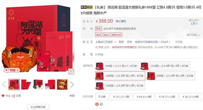 目前在售的蟹券品類繁多,價(jià)格差距較大。蟹券通常會(huì)標(biāo)稱1888型、2388型、2588型,電商平臺(tái)的商品參考價(jià)、劃線價(jià)格,以及券面標(biāo)稱價(jià)格很高,然而實(shí)際銷售差價(jià)較大。如天貓、京東等平臺(tái)的蟹券產(chǎn)品,劃線價(jià)格標(biāo)稱面值高達(dá)數(shù)千元,實(shí)際售價(jià)卻只有幾百元。