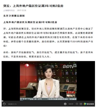 2017年12月30日,上海網(wǎng)警在公開(kāi)巡查執(zhí)法中發(fā)現(xiàn),微信公眾號(hào)“上海樓市風(fēng)云”發(fā)布了題為《突發(fā):上海外地戶籍居住證滿3年可購(gòu)2套房》的文章,文中杜撰“東方衛(wèi)視播出新聞,上海外地戶籍居民長(zhǎng)期居住證滿3年可購(gòu)2套房”、“此政策的最新解讀,可能會(huì)點(diǎn)燃在上海的外地戶籍居民購(gòu)買2套住宅的熱情,在接下來(lái)的市場(chǎng)中體現(xiàn),并帶動(dòng)整個(gè)交易量的提升,房?jī)r(jià)的提升,從而貫穿整個(gè)2018年的房地產(chǎn)市場(chǎng)”等內(nèi)容,并添加了新聞視頻片段,以提高其可信度。