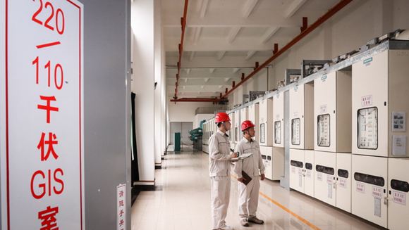 國網(wǎng)上海電力工作人員正在位于臨港的特斯拉配套變電站進(jìn)行立屏調(diào)試。