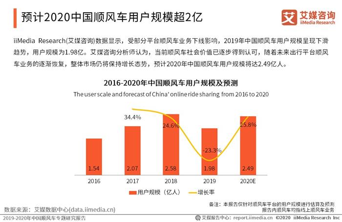 iiMedia Research(艾媒咨詢)數(shù)據(jù)顯示,受部分平臺順風車業(yè)務下線影響,2019年中國順風車用戶規(guī)模呈現(xiàn)下滑趨勢,用戶規(guī)模為1.98億。艾媒咨詢分析師認為,順風車憑借價格實惠、舒適便捷、共享環(huán)保的優(yōu)勢滿足用戶個性、多元的出行需求。隨著順風車行業(yè)安全建設的推進及平臺服務的升級,在不同生活場景下,用戶對順風車的需求日益增多。當前順風車社會價值已逐步得到認可,隨著未來出行平臺順風車業(yè)務的逐漸恢復, 整體市場仍將保持增長態(tài)勢,預計2020年中國順風車用戶規(guī)模將達2.49億人。