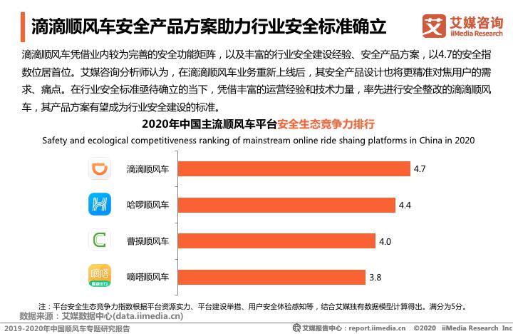 iiMedia Research(艾媒咨詢)數(shù)據(jù)顯示,滴滴順風車以4.7的安全指數(shù)位居首位。滴滴順風車憑借業(yè)內(nèi)較為完善的安全功能矩陣,以及豐富的行業(yè)安全建設經(jīng)驗、安全產(chǎn)品方案,在安全生態(tài)競爭力上處于行業(yè)領先地位。