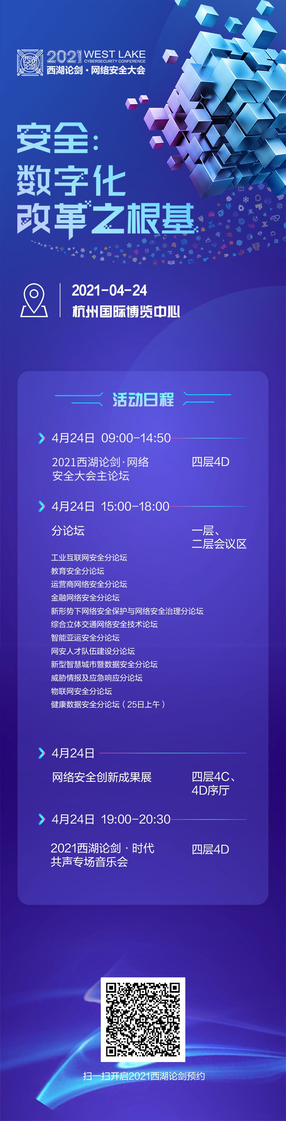 “十四五”開局之際,作為2021年國內(nèi)首場大型標志性網(wǎng)絡安全線下大會,緊抓數(shù)字化改革重要歷史進程,圍繞“安全:數(shù)字化改革之根基”這一主題,設立一場主論壇、十二場分論壇和一場網(wǎng)絡安全展覽。大會將于4月24日在杭州國際博覽中心舉行,屆時將進行線上同步直播。