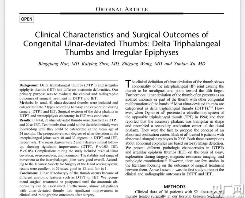 央廣網(wǎng)上海4月12日消息(記者楊靜 通訊員姜蓉)近日,國家兒童醫(yī)學(xué)中心(上海)、上海交通大學(xué)醫(yī)學(xué)院附屬上海兒童醫(yī)學(xué)中心骨科副主任醫(yī)師徐蘊(yùn)嵐團(tuán)隊(duì)正式公布一項(xiàng)最新臨床創(chuàng)新成果——一種關(guān)于拇指尺偏畸形的新型手術(shù)矯正方法。該項(xiàng)成果近期已于《Journal of Pediatric Orthopaedics》發(fā)表,該雜志是北美兒童骨科協(xié)會官方雜志、國際兒童骨科領(lǐng)域頂尖專業(yè)標(biāo)桿期刊,該文章也是近十年來上海小兒骨科專業(yè)領(lǐng)域首次被其收錄的研究成果。