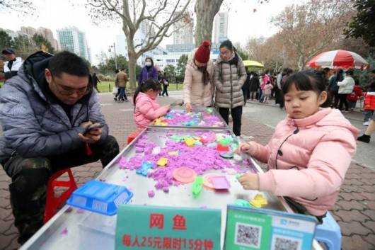 動(dòng)物島外和平鴿廣場也非常熱鬧,原本鴿子覓食的地方都被人流“占領(lǐng)”,小時(shí)候到公園必玩必吃的傳統(tǒng)項(xiàng)目,如“棉花糖”、“釣魚”、“糖畫”等,同樣吸引孩子以及家長。