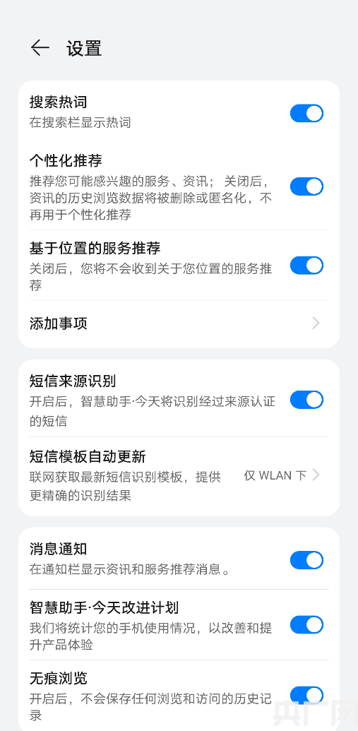 此外,用戶可以隨時(shí)方便地啟用、停用智能提醒服務(wù),或者對(duì)服務(wù)號(hào)進(jìn)行訂閱、取消訂閱。當(dāng)用戶停用智能提醒服務(wù)或取消訂閱服務(wù)號(hào)后,華為智慧助手·今天將不會(huì)再使用相關(guān)的個(gè)人信息。華為智慧助手·今天的“設(shè)置”中也為用戶提供了豐富的隱私保護(hù)功能開關(guān),用戶可以根據(jù)自身的需要,選擇打開或者關(guān)閉相應(yīng)的開關(guān)。例如,當(dāng)用戶關(guān)閉“個(gè)性化推薦”之后,資訊的歷史瀏覽數(shù)據(jù)將被刪除或者匿名化,華為智慧助手·今天也不會(huì)使用用戶的瀏覽歷史做個(gè)性化推薦。