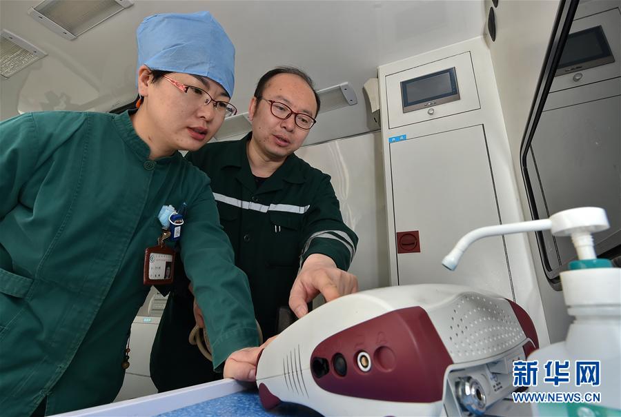 5月11日,許鵬飛為張娣介紹急救車上新進(jìn)的呼吸機(jī)的使用方法。 許鵬飛坐著急救車與時(shí)間“賽跑”,老婆張娣在手術(shù)室里搶救患者……結(jié)婚11年來,這對(duì)護(hù)士夫妻攜手奮斗在救護(hù)一線! -
