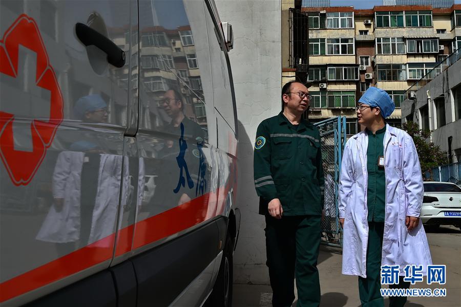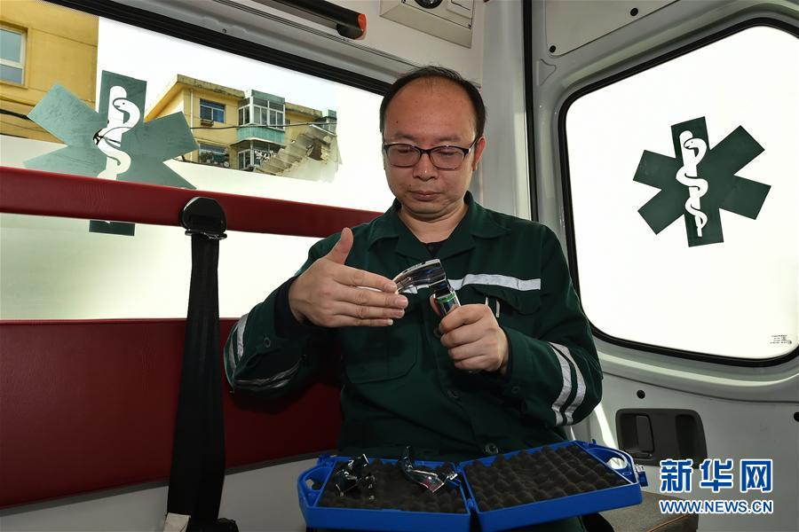 5月11日,許鵬飛在檢查太原市120急救中心急救車上的設(shè)備。 24小時(shí)候命的急救工作讓夫妻二人很少有時(shí)間顧家,家人的理解和支持讓他們倍感欣慰,同甘共苦的陪伴和救死扶傷的信念是他們堅(jiān)守在護(hù)理崗位的最大動(dòng)力! -