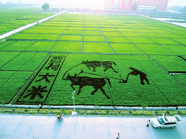 一幅稻田藝術(shù)畫亮相晉祠水稻公園,近日,一幅稻田藝術(shù)畫亮相晉祠水稻公園,碧綠的稻田中,兩頭健壯的“水!彪S稻穗飄蕩,栩栩如生,引得眾多游客嘖嘖稱奇。山西農(nóng)業(yè)大學(xué)董琦博士將農(nóng)業(yè)科學(xué)與美學(xué)藝術(shù)相結(jié)合創(chuàng)作設(shè)計(jì)了這一作品。(記者李全宏攝)
