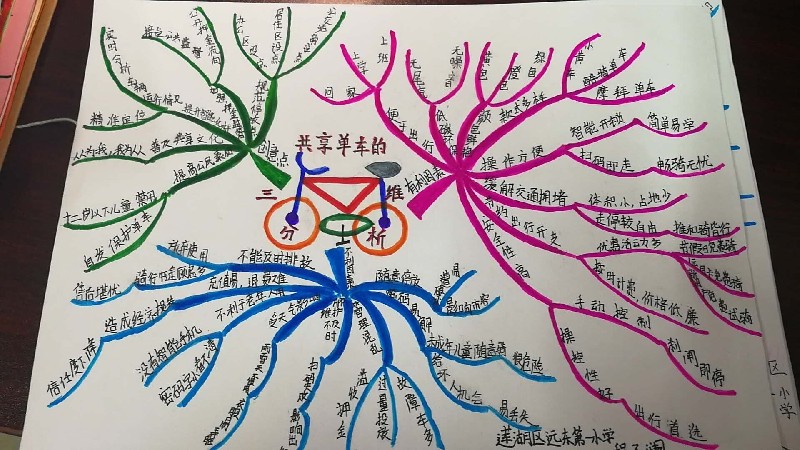 設計可折疊的共享單車,不使用時折疊起來擺放,節(jié)省城市空間;單車配備人臉識別功能,自動識別未成年人,只有成年人才可以“刷臉”開鎖;在城市道路上增加更多的自行車道,防止單車與行人、汽車混行;共享單車軟件與個人征信系統(tǒng)相連,成年人使用不需要交押金就可使用,也可避免未成年人使用;為了增加夜間騎車的安全性,可以在單車上裝上反光標貼和自動發(fā)電的車燈……同學們用思維導圖描述出他們五花八門的創(chuàng)意想法。班主任萬老師評價:“在我看來,孩子們的一些想法并不比大人差,還具有很強的的操作性,能夠看出他們在平日中對社會現(xiàn)象的觀察和思考。我們也希望孩子能通過此次話題探討,能夠提高他們對城市交通安全的認識、參與社會話題的熱情以及獨立思考的能力!