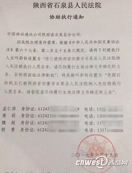 西部網(wǎng)訊(記者李媛 通訊員焦軍 尚君)“您撥打的機(jī)主已被陜西省安康市石泉縣人民法院納入失信被執(zhí)行人黑名單,請(qǐng)督促其盡快履行生效法律文書(shū)確定的義務(wù)”。這樣的彩鈴您從來(lái)沒(méi)聽(tīng)過(guò)吧!今后,這樣的彩鈴您在生活中或許就會(huì)遇到。石泉縣人民法院近日被安康市中級(jí)人民法院指定為“通信限制”試點(diǎn)法院,分別與石泉縣移動(dòng)、電信、聯(lián)通三大通信公司協(xié)商一致,將通過(guò)發(fā)送《協(xié)助執(zhí)行通知書(shū)》的方式請(qǐng)三大通信公司協(xié)助執(zhí)行,在陜西全省率先對(duì)“老賴”實(shí)施通信限制。