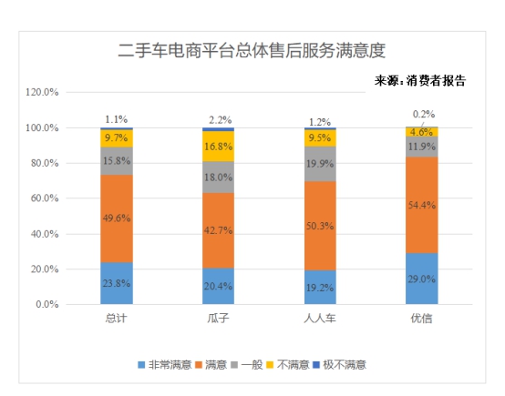 調(diào)查顯示,二手車電商平臺(tái)總體售后服務(wù)滿意度較高,73.4%的消費(fèi)者為其“點(diǎn)贊”。其中,優(yōu)信售后服務(wù)滿意度達(dá)到83.4%,其次是人人車69.5%,瓜子是63.1%。