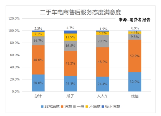 在售后服務(wù)態(tài)度方面,有5.3%的消費(fèi)者對(duì)優(yōu)信售后服務(wù)態(tài)度不滿,有6.8%的消費(fèi)者對(duì)人人車售后服務(wù)態(tài)度不滿,有16.6%的消費(fèi)者對(duì)瓜子的售后服務(wù)態(tài)度不滿。