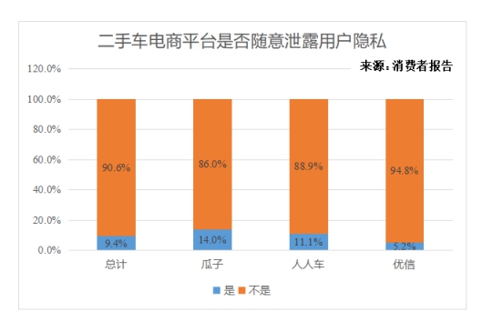 值得關(guān)注的是,有9.4%的消費(fèi)者認(rèn)為,二手車電商平臺(tái)存在泄露個(gè)人隱私信息的情況,其中瓜子這一情況最為突出,達(dá)到14%。二手車承載的個(gè)人信息較為豐富,信息泄露問題值得引起重視。