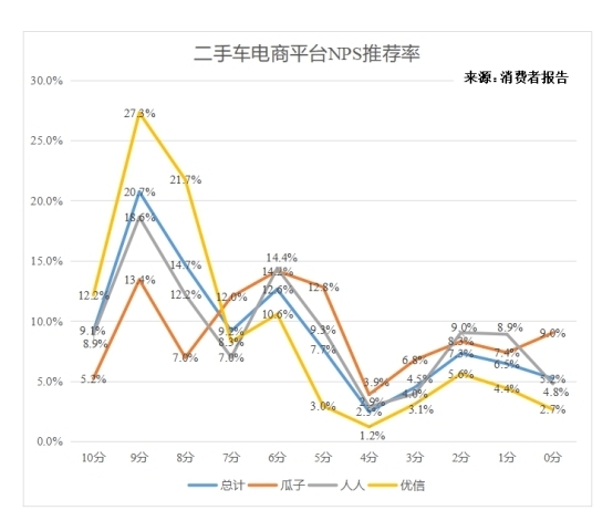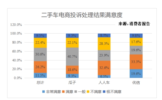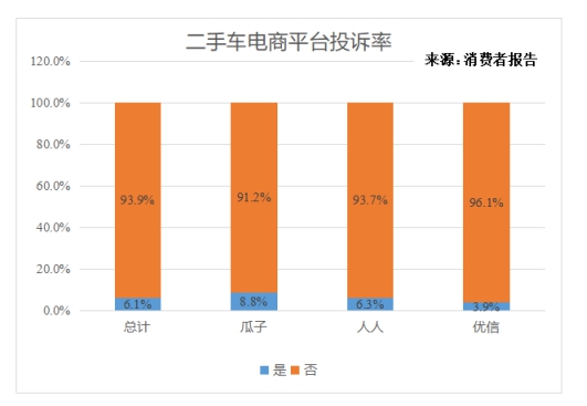 調(diào)查結(jié)果顯示,二手車電商投訴率為6.1%,三大平臺(tái)中投訴率最高的是瓜子,8.8%;其次是人人,6.3%;優(yōu)信為3.9%。