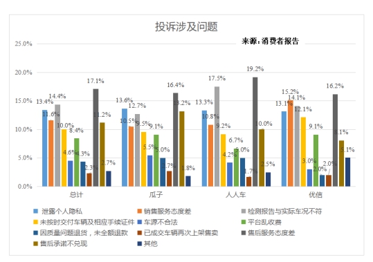 消費(fèi)者投訴最多的,是售后服務(wù)態(tài)度差、檢測(cè)報(bào)告與實(shí)際車況不符、泄露個(gè)人隱私三大問題。