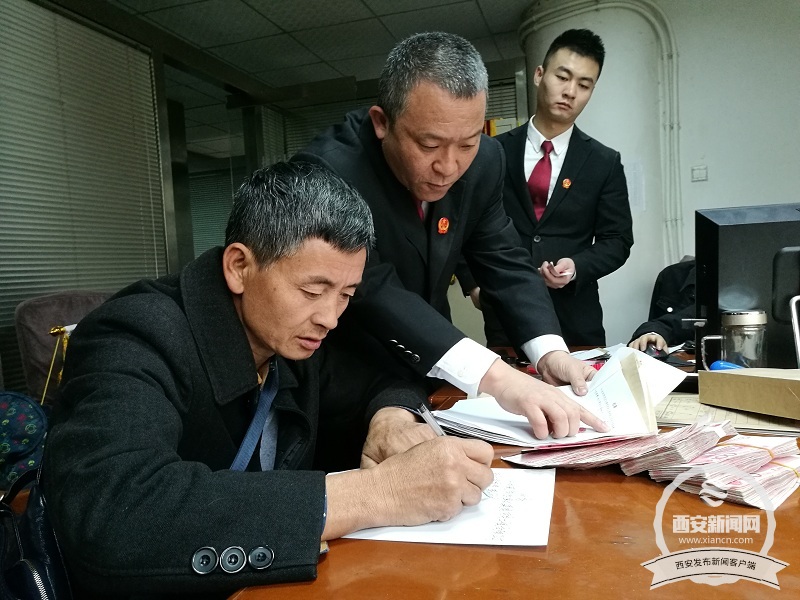 11月20日上午趕到西安的申請(qǐng)執(zhí)行人吳成貴,從法官手中拿到了期盼多年的工錢。他說,當(dāng)初是他叫11名老鄉(xiāng)跟他一起到陜西打工的,這幾年找不到老板、拿不到工錢,他面對(duì)老鄉(xiāng)時(shí)感覺很愧疚!拔冶緛硪呀(jīng)不抱希望了,沒想到這次一來到西安就順利拿到了工錢,謝謝西安的法官們!彼f。