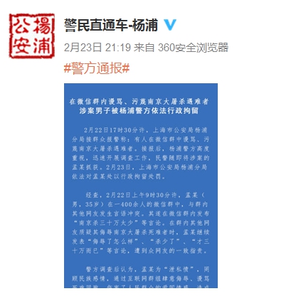 據(jù)上海市公安局楊浦分局官方微博消息,2月22日17時30分許,上海市公安局楊浦分局接群眾報警稱:有人在微信群中謾罵、污蔑南京大屠殺遇難者。接報后,楊浦警方高度重視,迅速開展調(diào)查工作,民警隨即將涉案的孟某抓獲。2月23日,上海市公安局楊浦分局依法對孟某處以行政拘留處罰。