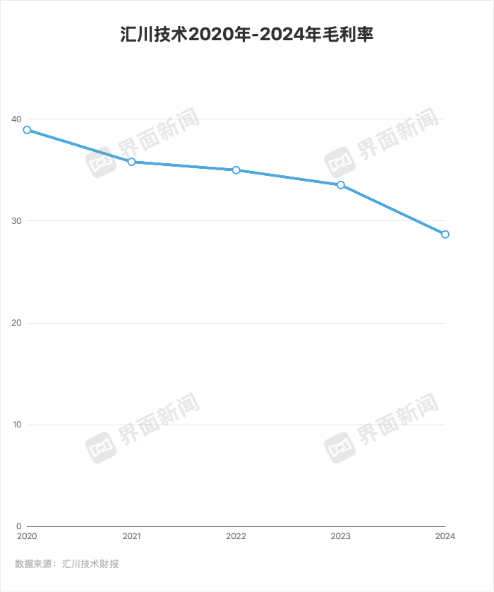 此外,匯川技術(shù)的毛利率也在不斷下滑。2020年匯川技術(shù)的毛利率為38.96%,至2024年已降至28.7%。這五年時間內(nèi),該公司的毛利率水平下降了超過10個百分點。