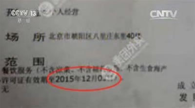 在美團(tuán)外賣的應(yīng)用平臺(tái)上,央視記者隨機(jī)搜索到一家“萬(wàn)記麻辣燙”的商家,登記在平臺(tái)上的地址為:朝陽(yáng)區(qū)八里莊東里小區(qū)41棟西側(cè)。而在美團(tuán)外賣平臺(tái)上商家資質(zhì)公示的證照上,登記的卻不是同一個(gè)地址。不僅如此,餐飲業(yè)必須具備的“三證齊全”卻只有“營(yíng)業(yè)執(zhí)照”和“餐飲服務(wù)許可證”兩證,而且這兩個(gè)證件上清晰地顯示,有效期截止日期均為2015年12月。