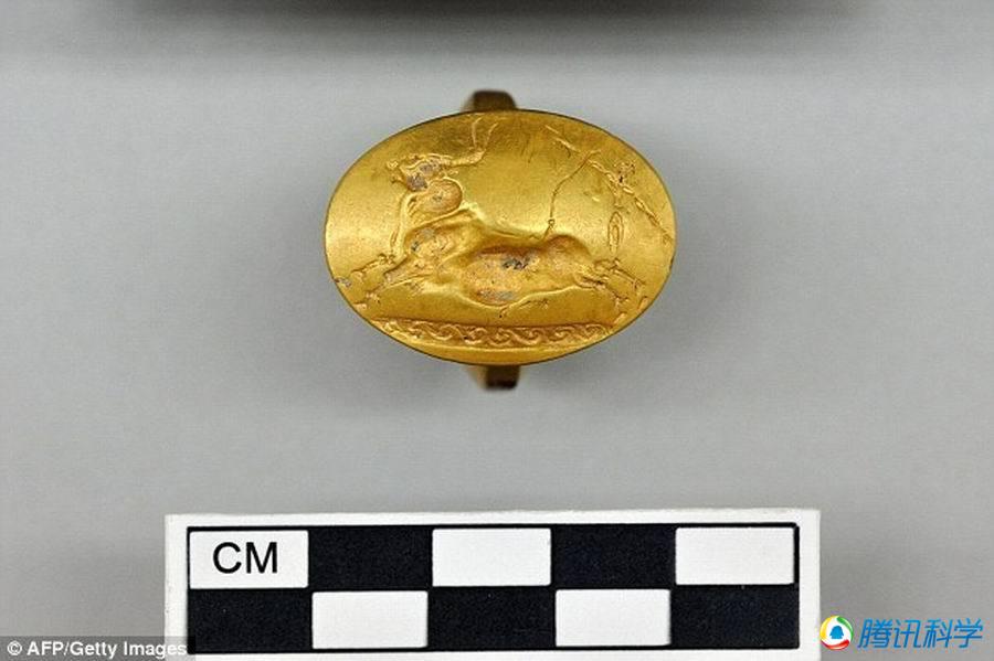 目前,考古學(xué)家在希臘境內(nèi)挖掘發(fā)現(xiàn)一具3500年前古代戰(zhàn)士墳?zāi),發(fā)現(xiàn)的大量珍寶有助于揭曉古希臘文明的起源?脊艑W(xué)家共挖掘發(fā)現(xiàn)4枚戒指,圖中是一枚金戒指,圖案顯示一只跳躍的公牛,這是古希臘克里特文明中一種最普通的圖案主題。(騰訊科學(xué)訊悠悠/編譯)