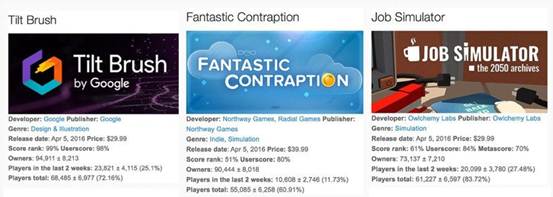 SteamSpy是steam的數(shù)據(jù)庫網(wǎng)站,就如同它的名字一般,真的是像個間諜一樣可以在上面查到所有你想要的關(guān)于steam的數(shù)據(jù),如購買人數(shù)、實時在線人數(shù)、玩的時長等。HTC vive于2016年4月發(fā)貨,在4月-7月這段早期發(fā)售時間里vive以捆綁銷售的方式捆綁了3款游戲《Tilt Brush[iii]》、《FantasticContraption[iv]》和《Job Simulator[v]》在vive里,那么通過看這段時間里這3款游戲的持有人數(shù)量就能大致的推斷截止7月底HTC vive的銷量。如下圖:
