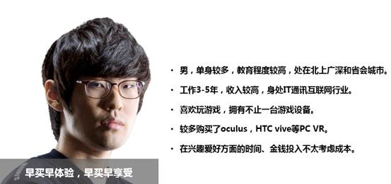這類用戶的精力旺盛,追逐刺激體驗,大都在購買前有在各種渠道(借別人的、體驗店等)體驗過,對VR帶來的全景體驗覺得新奇,對VR游戲特別期待。猴急猴急的想自己擁有一臺VR,覺得酷斃了。這里想想自己當(dāng)年想買游戲機(jī)時候急切的心情就是了。